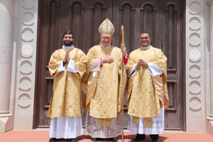 (In the photo are Deacon Michael Caraway, left, Bishop Glen John Provost, center, and Father Samuel Orsot, right.)