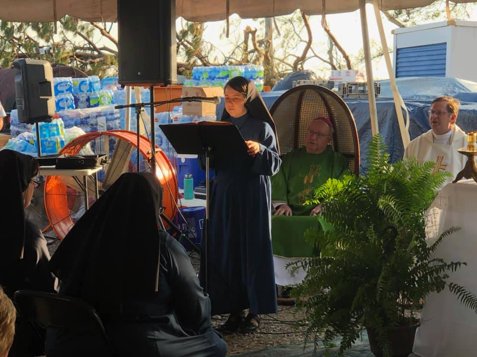 Sister Miriam MacLean, R.S.M., director of Catholic Charities of Southwest Louisiana, proclaims one of the readings for a special Mass officiated by Bishop Glen John Provost for the recovery workers and victims of Hurricane Laura in Cameron Parish.