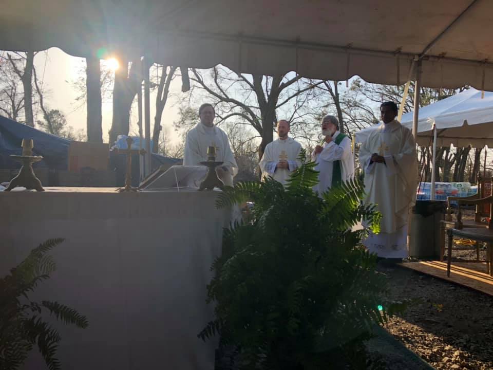 The Very Rev. Ruben Buller, VG, from left; Rev. D.B. Thompson, Rev. Clyde Thomas, and the Very Rev. Rojo A. Palatty Koonathan, HGN, VF, concelebrated with The Most Reverend Glen John Provost, Bishop of Lake Charles, during a special Mass on Sunday, September 6, in Cameron Parish for Hurricane Laura survivors and recovery workers.