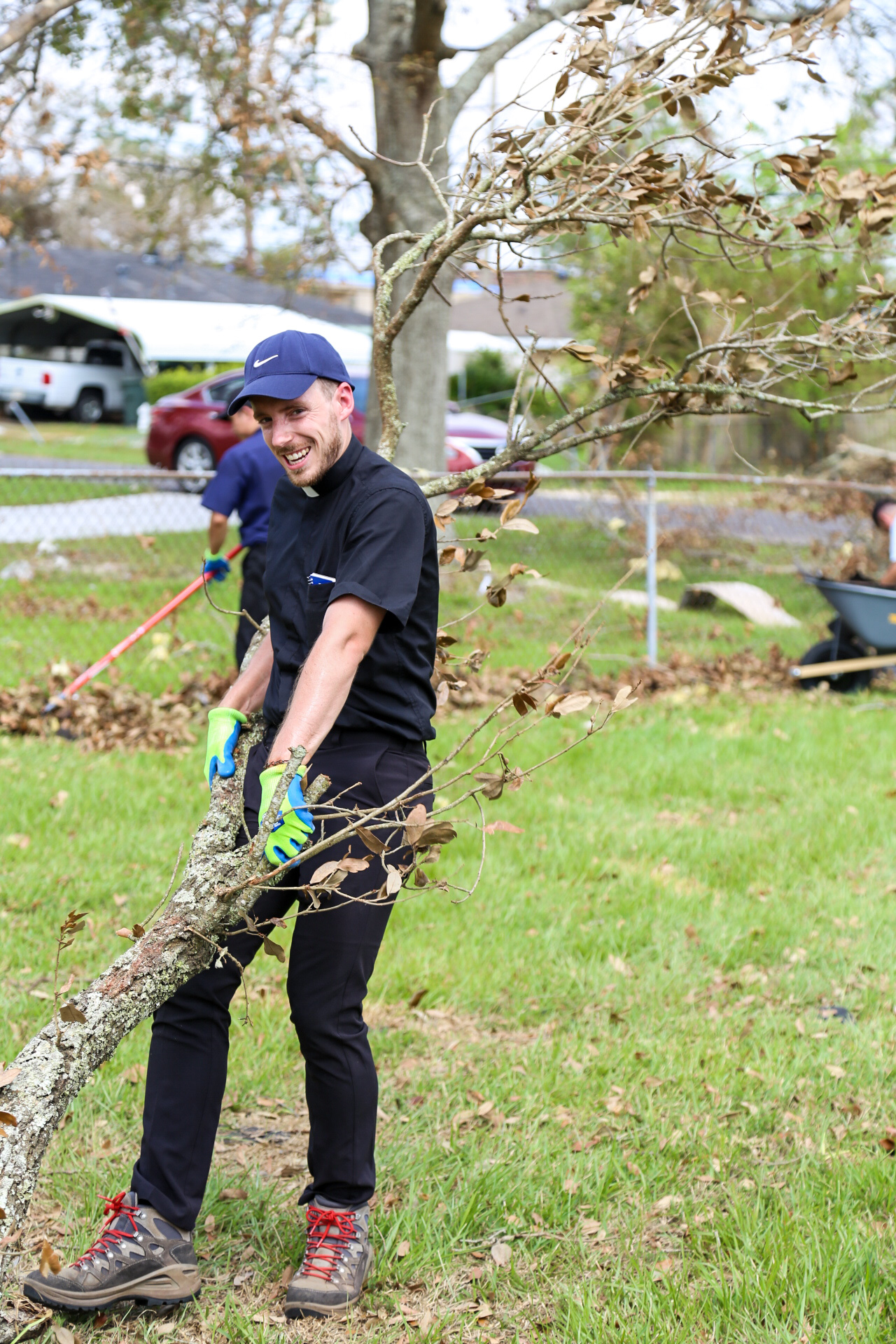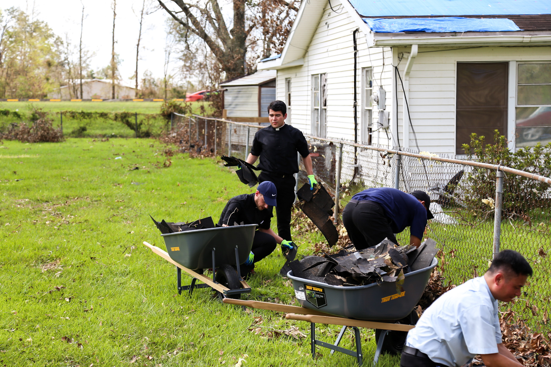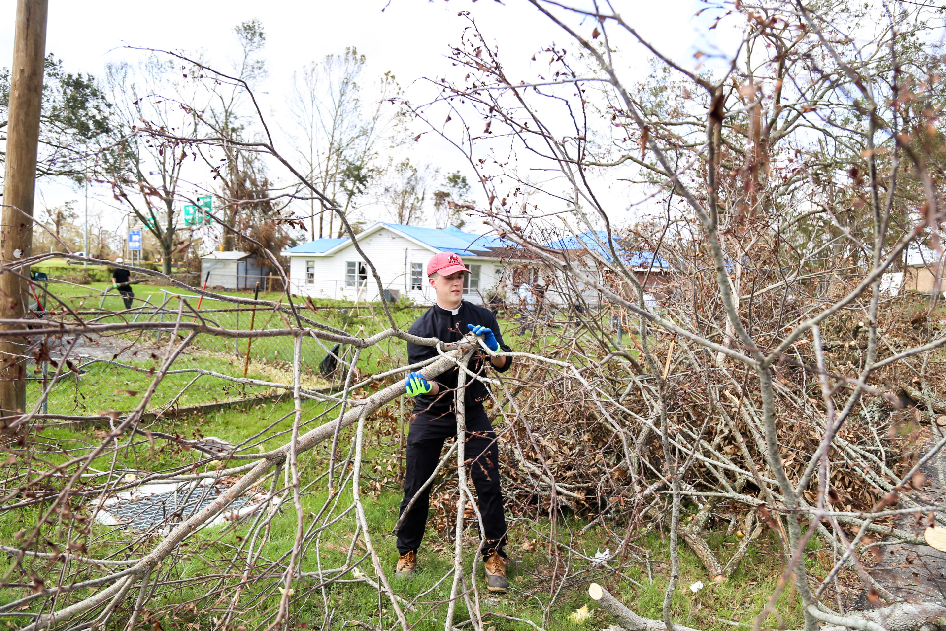 Above and below: Seminarians assisting with the Notre Dame Seminary Catholic Relief effort help clean up debris in the yards of the homebound in the Diocese of Lake Charles. The "mission trip" was organized following the devastating Category 4 Hurricane Laura that destroyed many homes, businesses, churches and schools in Southwest Louisiana as it made landfall on August 27.
