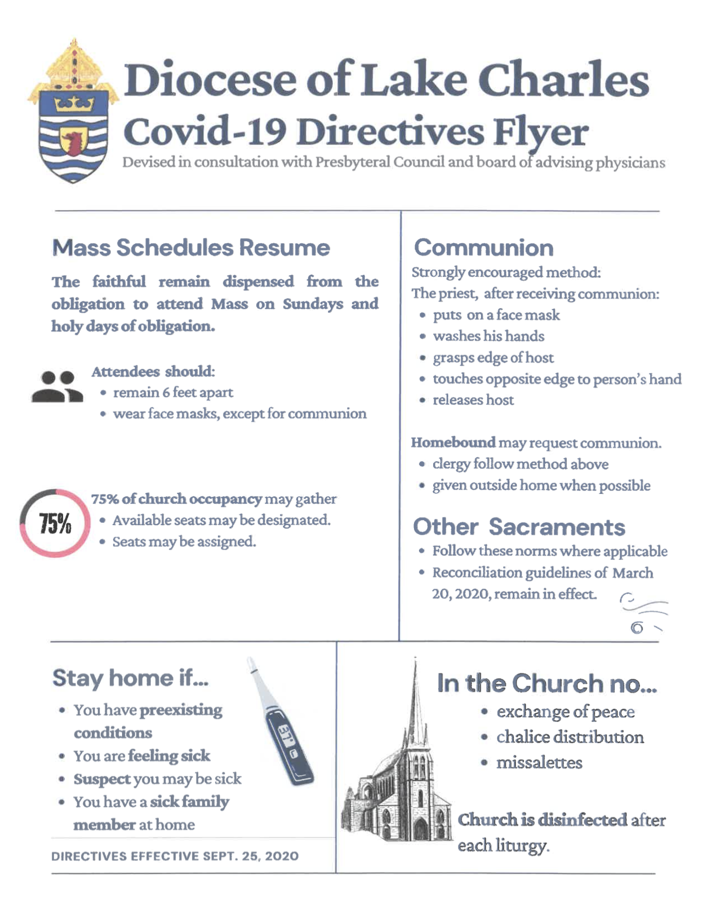 The following COVID-19 guidelines were compiled in consultation with the Presbyteral Council of the Diocese of Lake Charles and a board of advising physicians regarding the state of Louisiana operating under Phase 3. They are effective beginning on Friday, September 25, 2020.