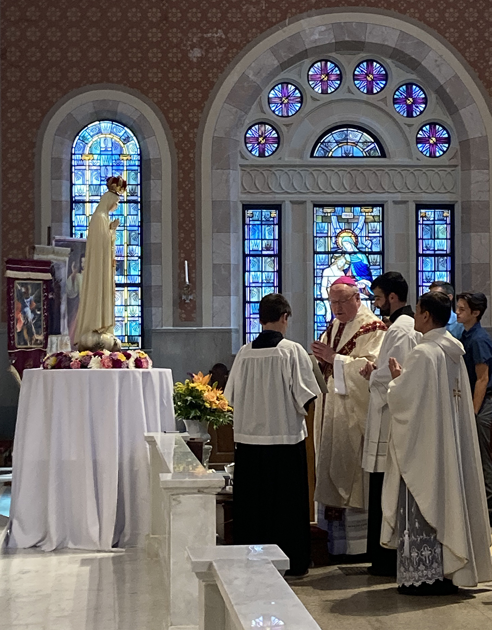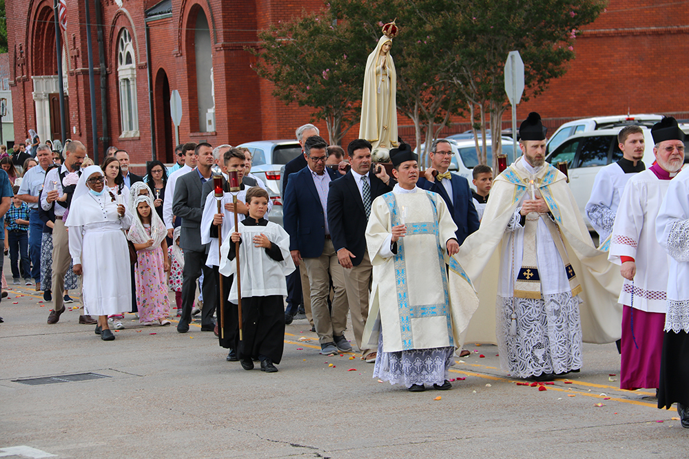 Our Lady’s visit at the Cathedral coincided with the Solemnity of the Assumption of the Blessed Virgin Mary on Aug. 15. Hundreds of people took to the streets of downtown Lake Charles to share the Fatima message with a Marian procession in the evening. Earlier in the day, Bishop Glen John Provost consecrated the Diocese of Lake Charles to the Immaculate Heart of Mary.