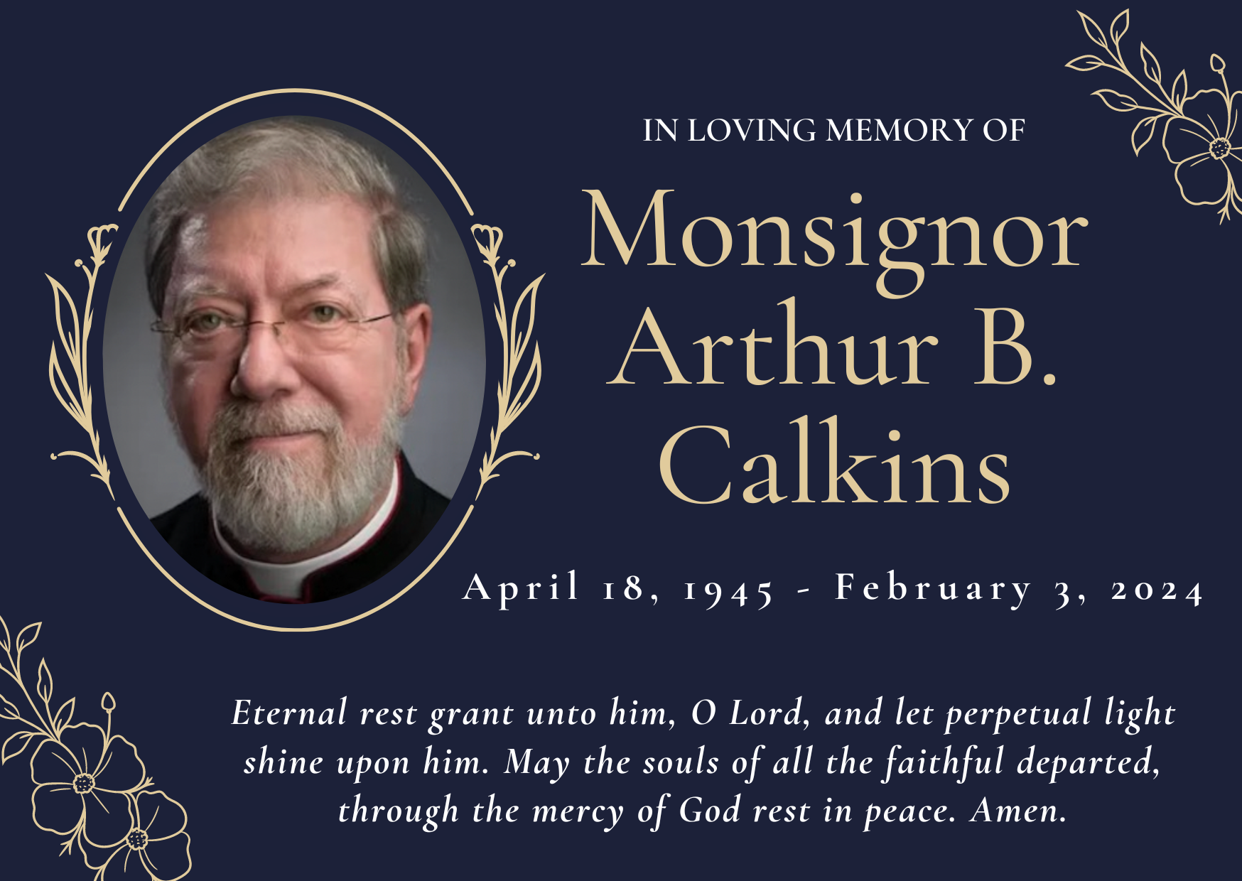 In the spirit of Christian hope, the Diocese of Lake Charles announces the death of Reverend Monsignor Arthur B. Calkins who passed away on Saturday, February 3, 2024. Monsignor Calkins, a priest of the Archdiocese of New Orleans, was in residence at Our Lady of Prompt Succor Catholic Church in Sulphur, La. The Order of Christian Funeral will be celebrated on the following schedule: