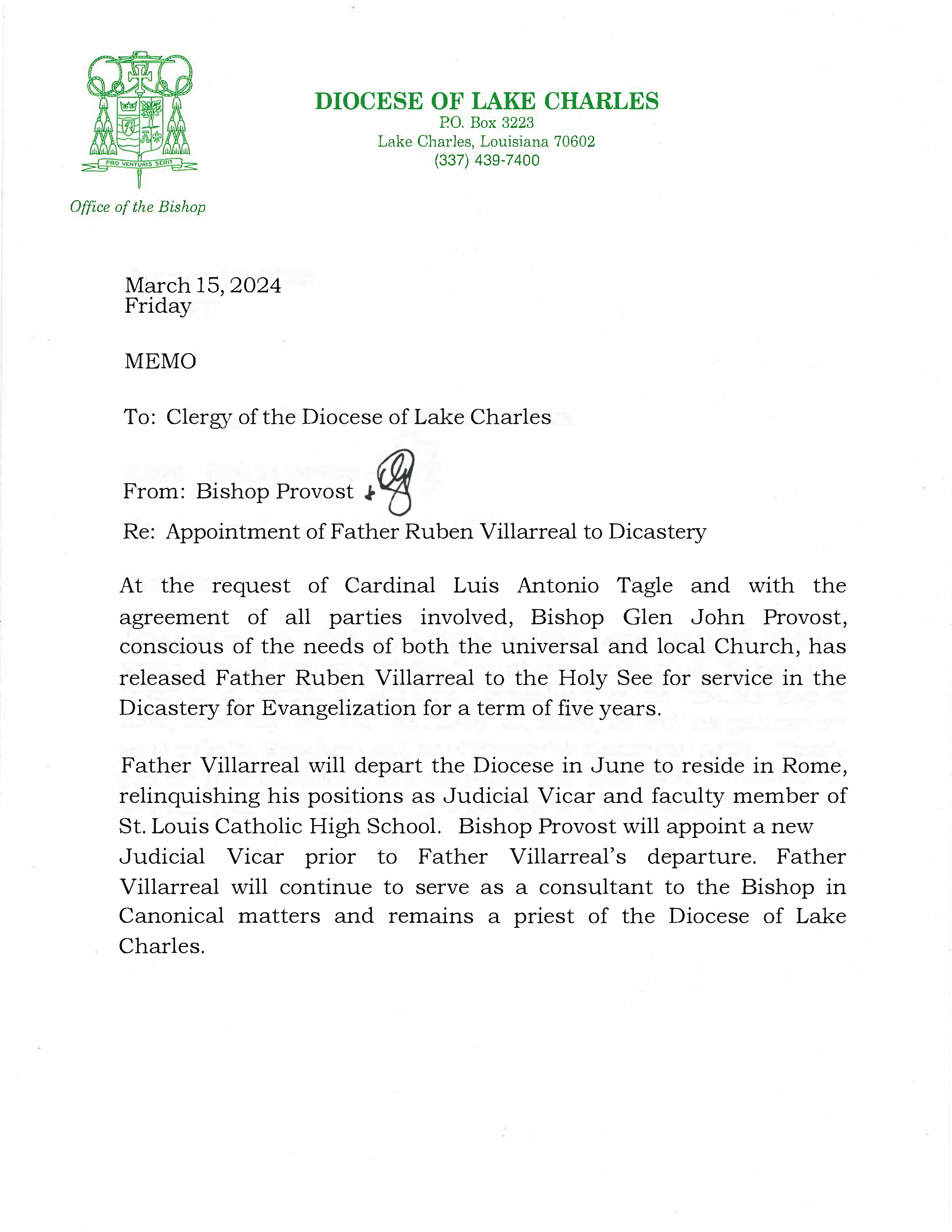In a memo addressed to Clergy of the Diocese of Lake Charles on Friday, March 15, 2024, Bishop Glen John Provost announced the appointment of Father Ruben Villarreal to the Dicastery for Evangelization in the Holy See. The memo reads: