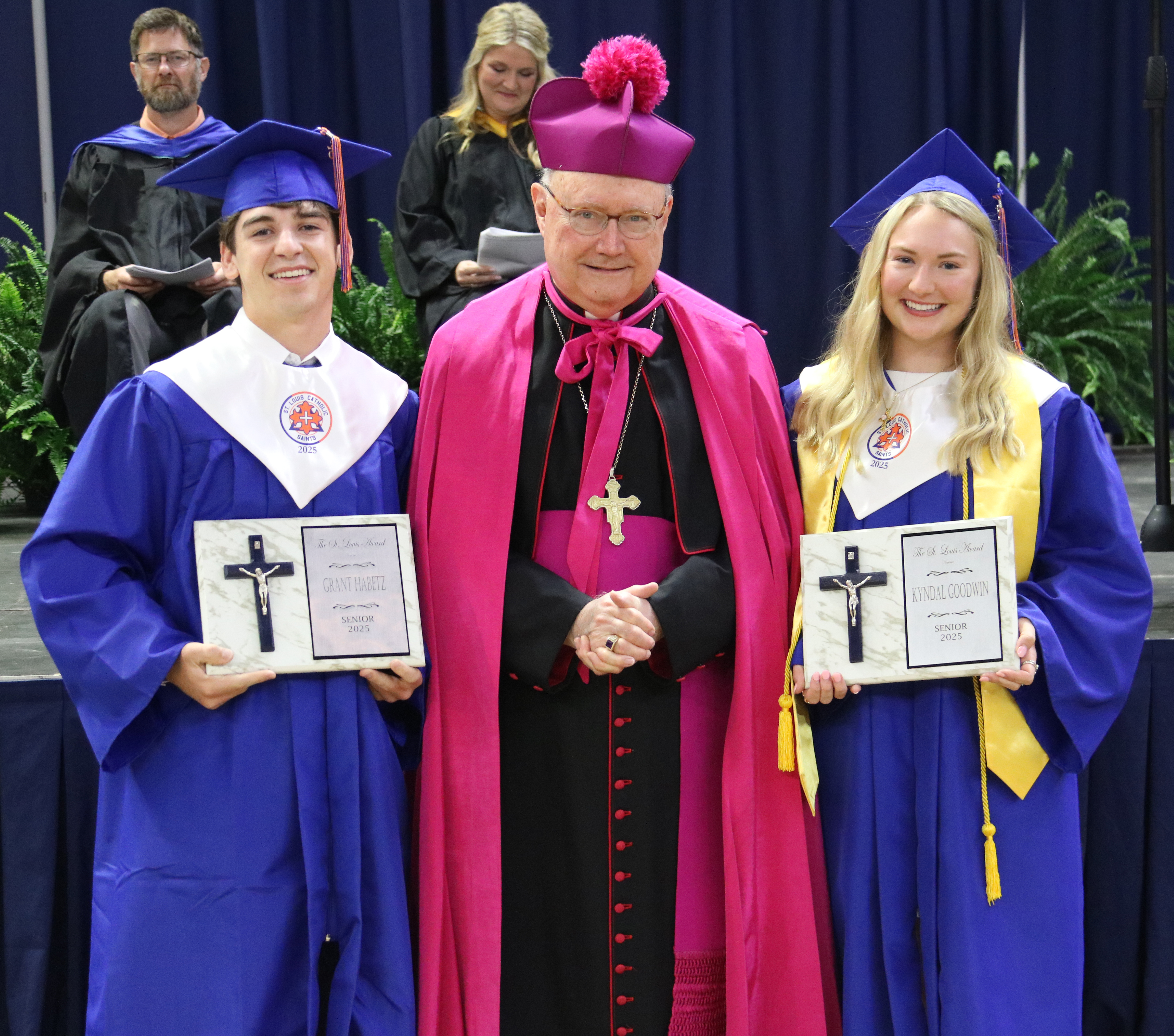 Grant Habetz and Kyndal Goodwin received the St. Louis Awards at the May 13 commencement ceremony. The Most Reverend Glen John