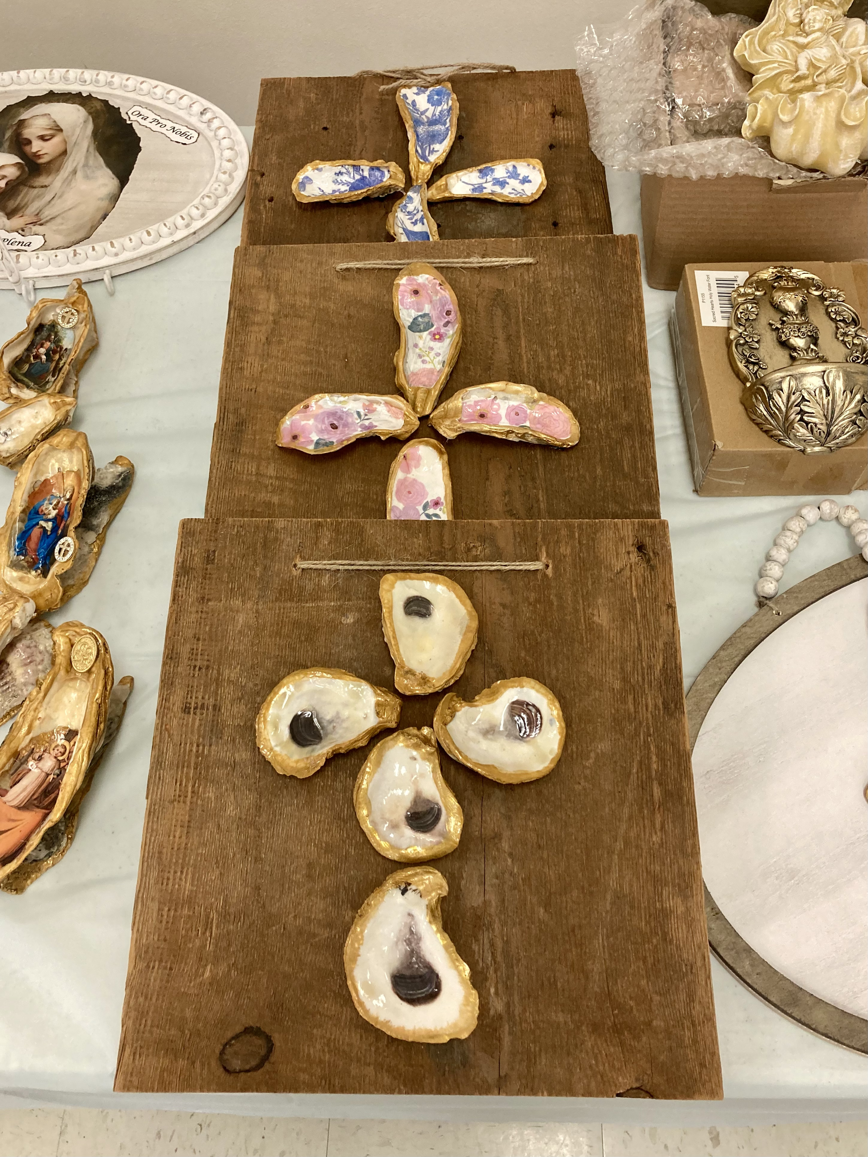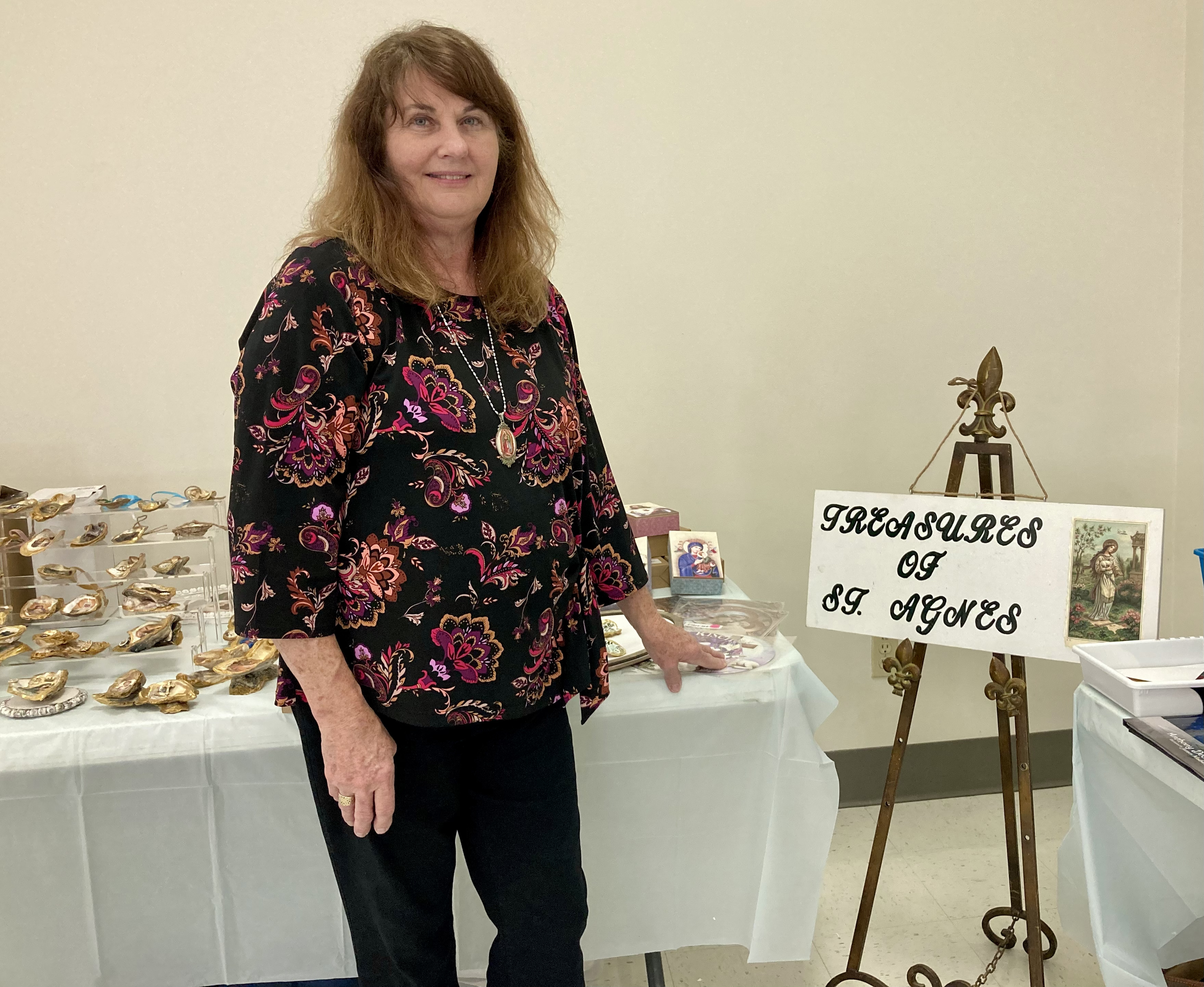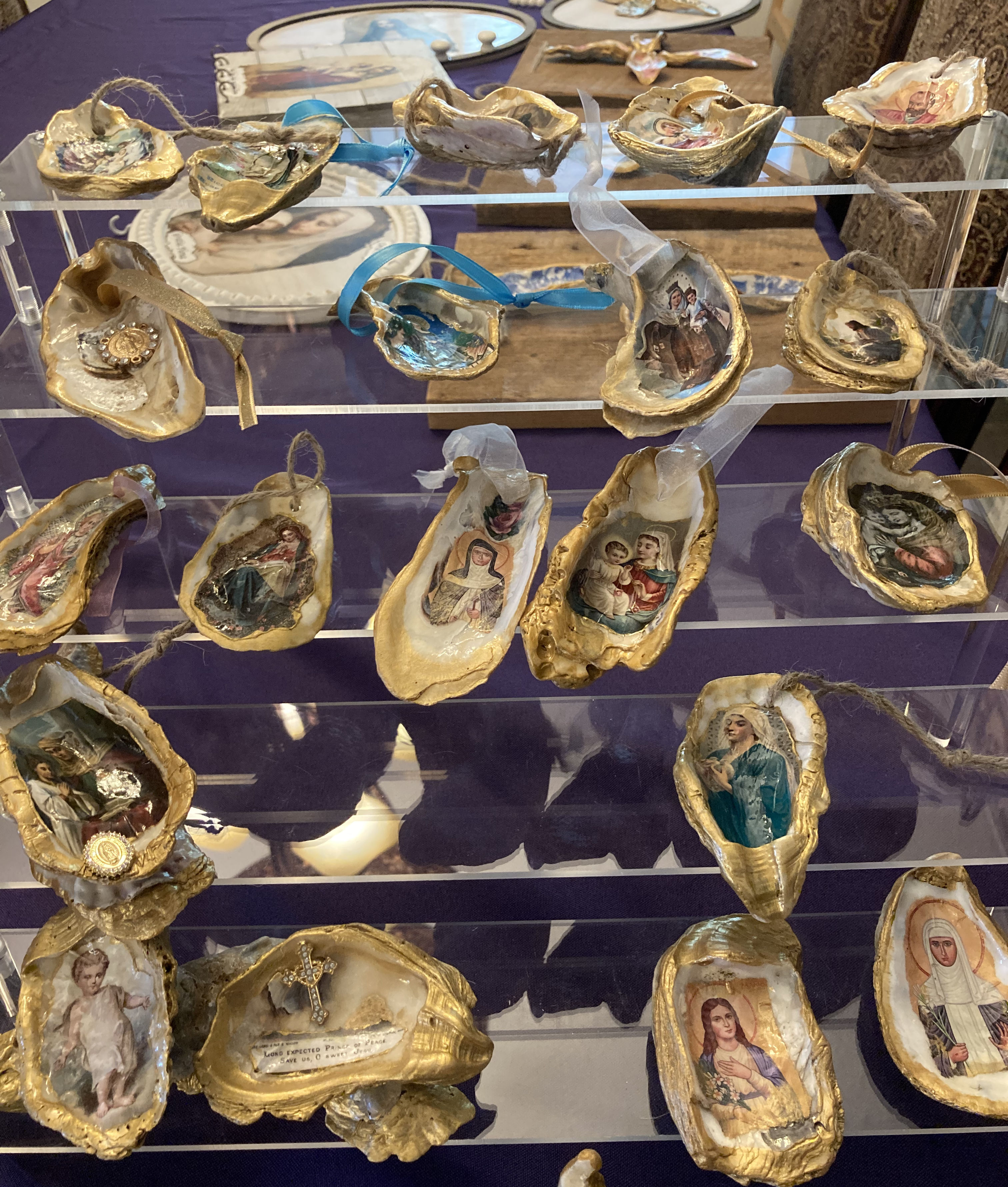 When the weather is favorable, Andrea sets up shop for Treasures of St. Agnes outside after all weekend Masses. Among the many selections of religious items ranging from children’s books, icons, statues, pillowcases, aprons, mugs, hats, rosaries and rosary holders, are her unique oyster shell creations.