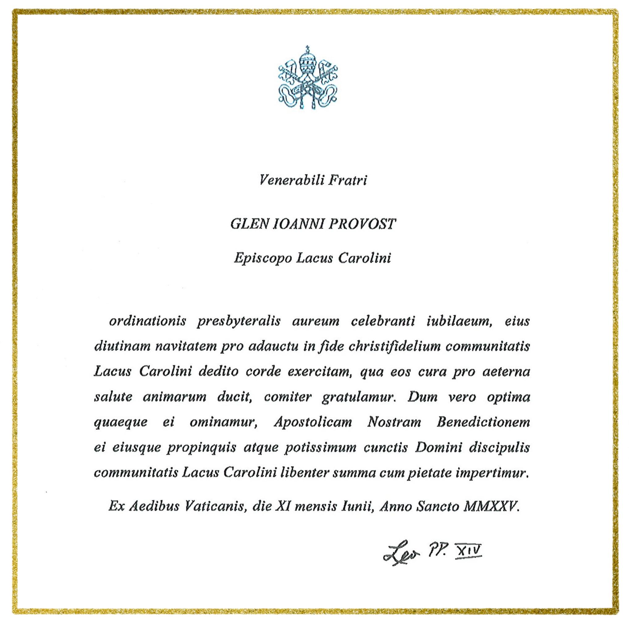 At the conclusion of the Mass, Father Buller read a letter, written in Latin, from Pope Leo XIV congratulating Bishop Provost on the 50th anniversary of his presbyteral ordination. The papal letter expressed the bishop’s “long-standing zeal, exercised with a devoted heart, for the growth in faith of the Christian faithful of the community of Lake Charles, which he leads with a concern for the eternal salvation of their souls.”