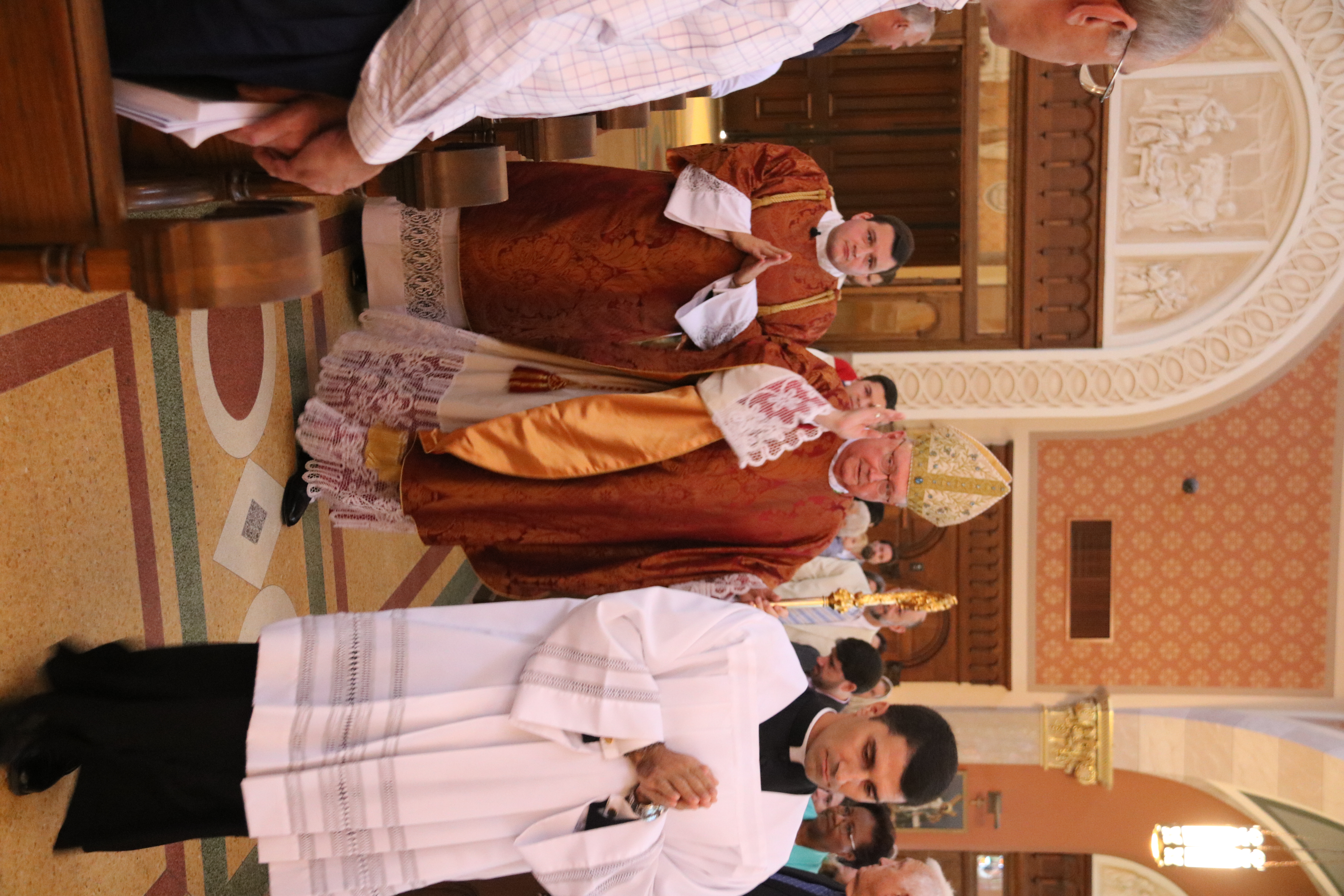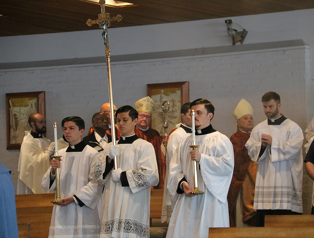 Concelebrating with Bishop Provost were Bishop Emeritus Sam G. Jacobs from the Diocese of Houma-Thibodaux, Very Rev. Ruben J. Buller, V.G., Pastor of the Cathedral; Rev. Michael Beverung, Parochial Vicar of the Cathedral; Rev. Michael Caraway, Vocations Director; and Rev. Bryce Sibley, Notre Dame Seminary Professor, and Rev. Cyprian O. Eze, both from the Diocese of Lafayette. Also assisting were Deacon Brian Soileau, Deacon Hunter LaRocca, and seminarians from the Diocese of Lake Charles, with Very Rev. Joseph Caraway serving as Master of Ceremonies.