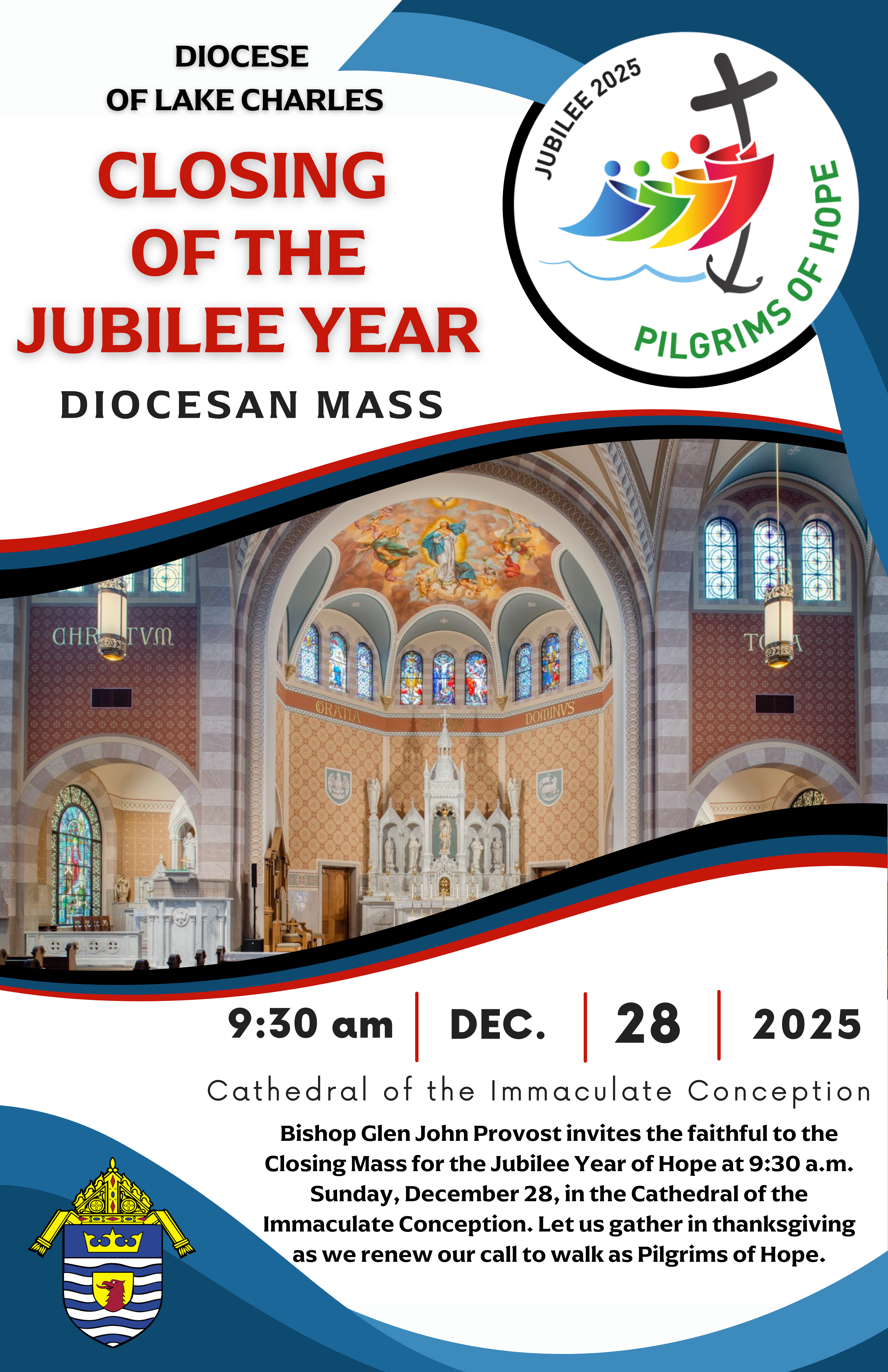 His Excellency, Bishop Glen John Provost, invites the faithful to the Closing Celebration Mass for the Jubilee Year of Hope at 9:30 a.m. Sunday, December 28, in the Cathedral of the Immaculate Conception, 935 Bilbo Street. As we conclude this holy year locally in the Diocese of Lake Charles, let us gather in thanksgiving and prayer as we commend the fruits of this sacred year to the Lord and renew our call to walk as Pilgrims of Hope in our communities. The Jubilee Year of Hope will officially conclude on January 6, 2026, when the Holy Door of St. Peter's Basilica is closed.
