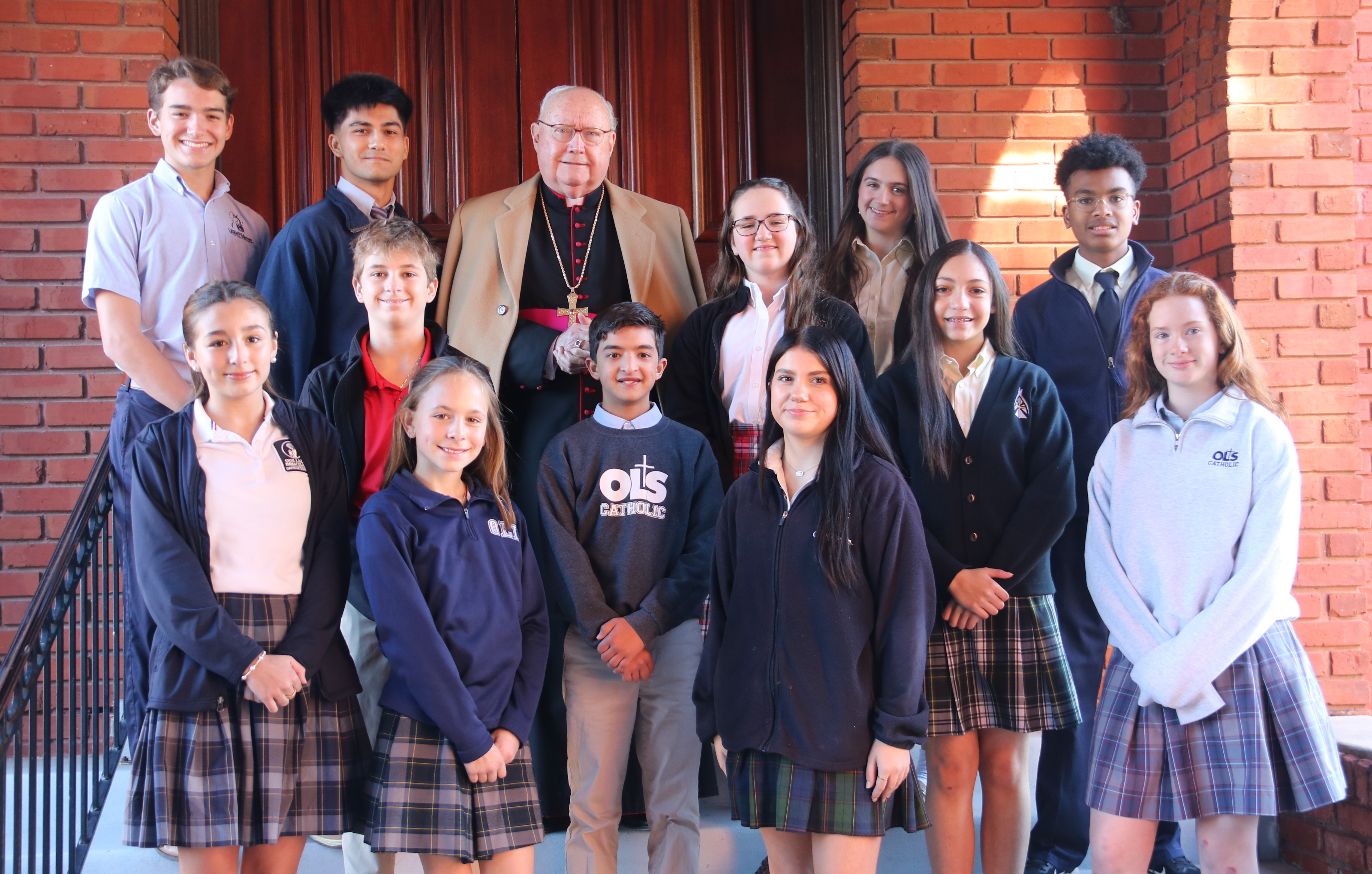 School representatives joining Bishop Glen John Provost outside the Cathedral of the Cathedral of the Immaculate Conception before the Catholic Schools Week Mass on January 28 are front row, from left, Ana Boudreaux (OLI), Emily Bougard, (OLI), Henry Anderson (OLS), and Jaleigh Roque (OLQH); middle row, from left, Thomas Abendroth (ICCS), Cecilia Reeves (ICCS), Abby Gatlin (SMCS), and Genevieve Thomas (OLS); back row, from left, Lee O’Quin (OLQH), Benjamin Duplechin (SLCHS), Olivia Tassin (SLCHS), and Kyle Stevenson (SMCS).